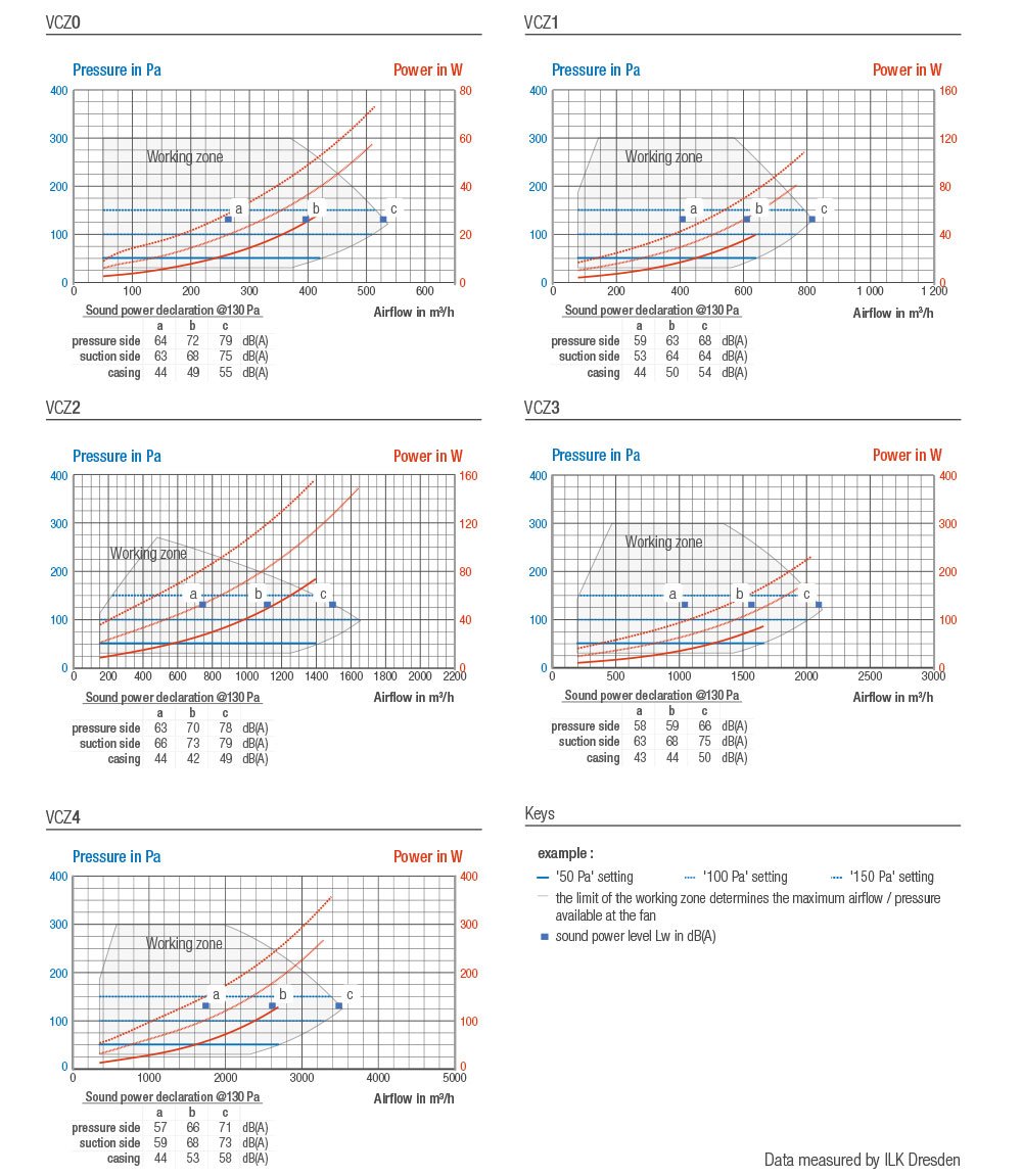K dispozici je 5 modelů: průtok vzduchu od 500 m3/h až do 4 100 m3/h, tlak do 300 Pa. Ventilátory jsou určené pro bytové domy, kanceláře, školy a další budovy.